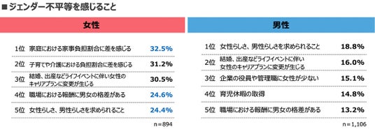 男女でジェンダー不平等を感じる内容に認識の差女性1位は「家庭における家事負担割合」男性1位は「男性らしさを求められる」