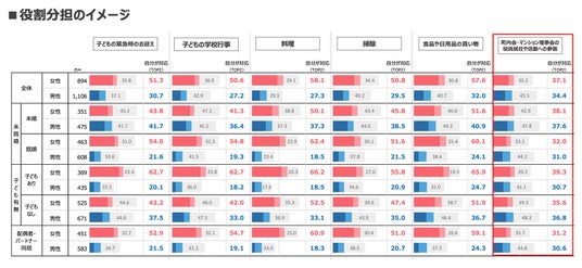 子ども関連と一般的な家事での役割分担イメージを比較すると、各層で女性の「自分が対応」という回答が男性を上回る結果となりました。一方、「町内会・マンション理事会の役員就任や活動への参画」のような責任や役割が明確なシーンでは、子ども関連や一般的な家事に比べ男女差は均衡傾向に。つまり、一般的な家事においては、夫と妻、父親と母親という環境下で「(男性ではなく)女性が対応する」というアンコンシャスバイアス(無意識の思い込みや偏見)が存在していることが考えられます。