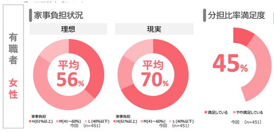 女性の家事における負担割合の「理想と現実」の平均値について、女性は理想が56%なのに対し現実が70%と14ポイントのギャップが生じています。分担比率満足度も45%と男性よりも14ポイント下回る結果となりました。