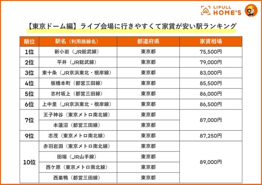 【東京ドーム編】最寄りの春日駅・後楽園駅・水道橋駅いずれかに20分以内にアクセスできて家賃が安い駅1位は「新小岩駅」!