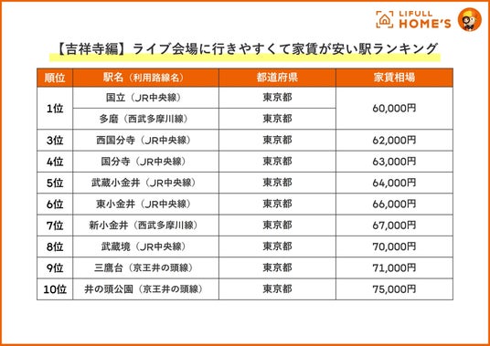 【吉祥寺編】1位は「国立駅」&「多磨駅」!今回のランキングで最安値の6万円!