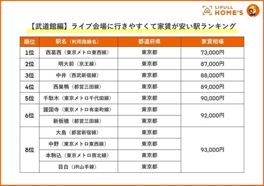 ライブに行くのが趣味の方にとっては、会場にアクセスしやすいことは交通費や時間の面でもメリットがあるはず。そこで、LIFULL HOME’Sでは、ライブハウスが集まる「吉祥寺駅」・「高円寺駅」・「渋谷駅」・「下北沢駅」・「新宿駅」、そして大物アーティストの公演やツアーの千秋楽が行われ、「ライブの聖地」にもなっている「武道館」・「東京ドーム」の最寄り駅にそれぞれ20分以内にアクセスできる駅を単身向け賃貸物件の家賃相場が安い順にランキング化しました。