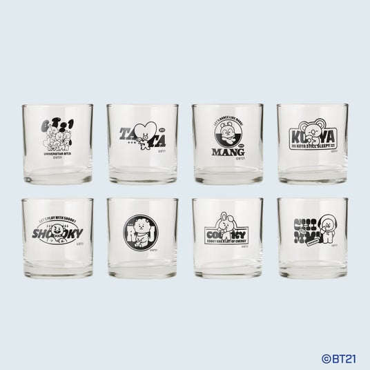 BT21がプリントされたキュートなグラスが登場しました。氷を入れてロックにしたり、炭酸割りや牛乳割りなどさまざまなアレンジを試すのにもぴったりのロックグラスです。全8種類のデザインの中から好きなグラスをお選びいただけます。