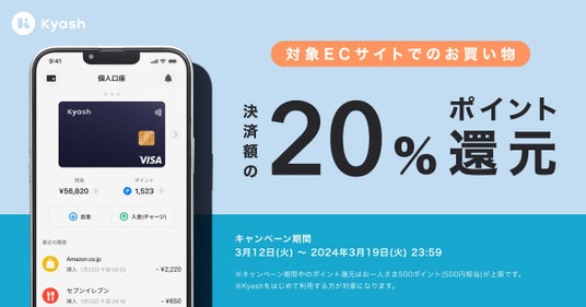 株式会社Kyash(本社:東京都港区、代表取締役社長:鷹取 真一、以下「当社」)が運営するデジタルウォレットアプリKyashにおいて、Kyashを初めて利用する方限定に対象サイト(EC、電子コミック・書籍)でのお買い物で決済額の20%ポイント還元キャンペーンを開始します。