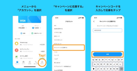 2. Kyashアプリのメニュー内の「キャンペーンに応募する」画面に本キャンペーンのキャンペーンコードを入力する