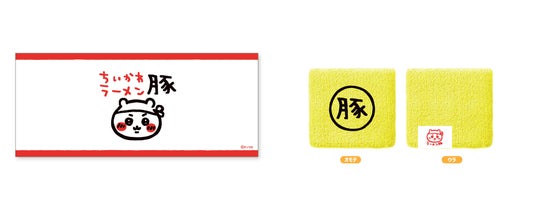 「ちいかわラーメン 豚」のオリジナルグッズは、公式ECショップ「ちいかわマーケット」でも販売予定でございます。またオリジナルボトルの黒烏龍茶は、名古屋PARCO館内に自動販売機を設置し販売を予定しております。