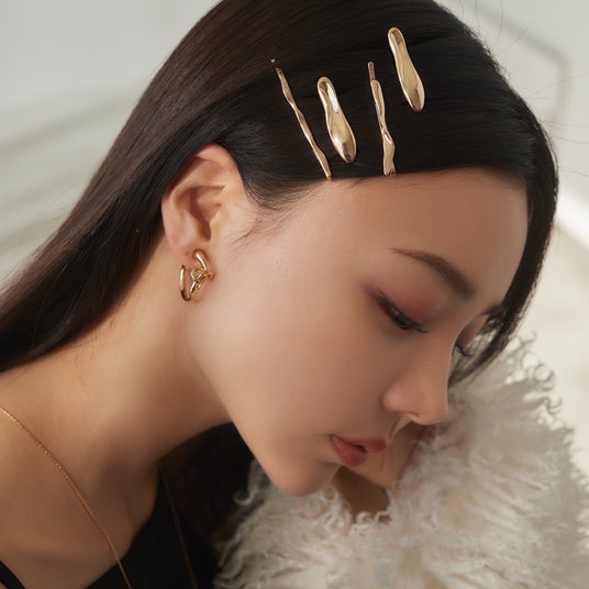 ロングネックレス¥2,420/イヤリング¥2,860/メタルヘアピンセット¥2,420LOOK3顔まわりにさっととめるだけでしっかり主張するヘアピンはネックレスとの相性も抜群。結び目モチーフのイヤリングは、痛くなりにくい実用新案登録済のアイテム。