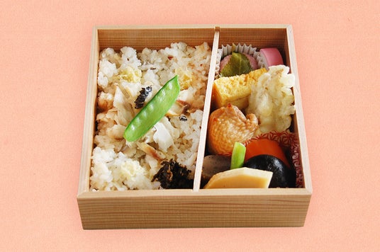 桜鯛の炊込みご飯/だし焼き筍の天ぷら/鶏の照焼/野菜煮物/蒲鉾/玉子焼/桜もち