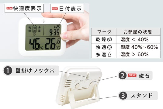 従来の使いやすさに加え、世の中に数多く出回るデジタル温湿度計よりも多機能で使いやすい商品へと生まれ変わります。