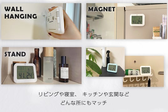生活をもっと快適に、もっと便利にする「mitasデジタル温湿度計」のリニューアル版。 家庭での日常使いはもちろん、オフィスや学校、さまざまな公共施設での利用にも最適です。