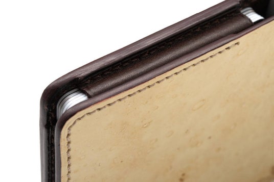 端部は、革を重ねて外側で縫い合わせます。これは「薄さ」にこだわるためです。革を折り返して内側に巻き込むと、サイズは小さくできますが、革が重なり、厚くなります。