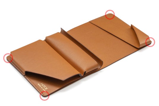 金物を一切使用せず、縫製もたった4本しかありません。さらに、傷みやすい角は表革と内革を重ね、耐久性を高めています。