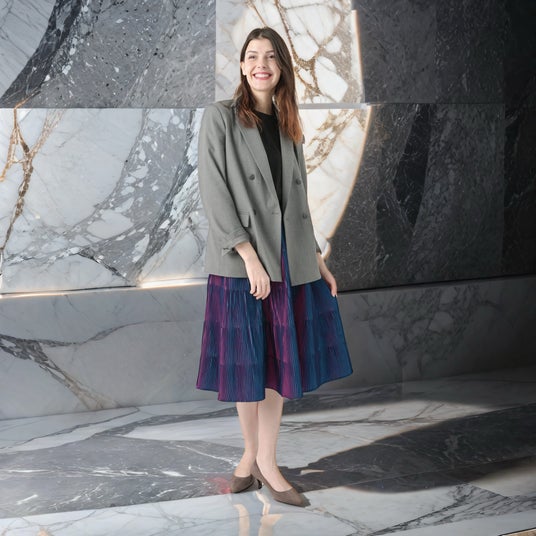 見る方向により色が変わる「3Dプリーツ」製法と、デザインされたドレープが相まって、オーロラのような、美しいゆらめきを表現します。