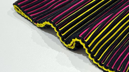 秘密は3色の糸でつくる立体的な生地。このカラーの場合、メインカラーである黒の内側に、黄色とピンクの2色を編みこむことで、特殊な見え方の生地に仕上がっています。