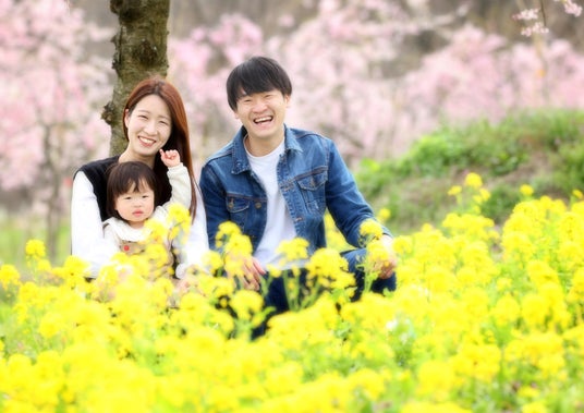 春色の花畑で記念の1枚を
