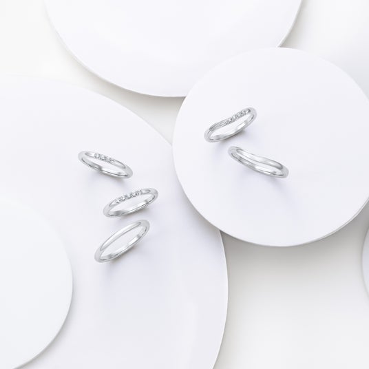 細身で重ね付けしやすいウェーブラインとシンプルなストレートライン。純プラチナの凛とした輝きは、ロイヤル・アッシャー・ダイヤモンドの白く高貴な輝きとも相性がよく、生涯にわたってご愛用いただくマリッジリングとして最適です。