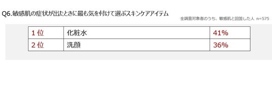 敏感肌の症状が出たときに最も気を付けて選ぶアイテムの1位は化粧水が41%と最も多く、次いで洗顔料が36%でした