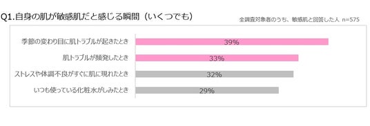 敏感肌の人が「自身の肌が敏感肌だ」と感じる瞬間で最も多いのは、「季節の変わり目の肌トラブル」、次に「肌トラブルが頻発したとき」と回答しました。
