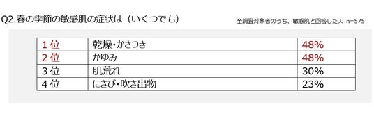 敏感肌の人に「春の季節にどのような敏感肌の症状がでるか」を聞いたところ、最も多いのは乾燥・かさつき、次いでかゆみと答えており、いずれも2人に1人が悩んでいることがわかりました。