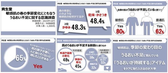 資生堂が「敏感肌の春の季節変化にともなう うるおい不足に関する意識調査」を実施し、敏感肌の春の季節の肌悩みを聞くと、最も多いのは乾燥・かさつきで、2人に1人が悩んでいることが分かりました。また、敏感肌の約8割は自身の肌がうるおい不足だと感じており、普通肌と比較しても年中うるおい不足だと感じている人が約8割にのぼることもわかりました。