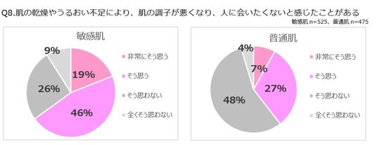 敏感肌、普通肌の人に「肌の乾燥やうるおい不足により、肌の調子が悪く人に会いたくないと感じたことがあるか」を聞いたところ、敏感肌では65%・普通肌では35%と心理的な影響に大きく差があることがわかりました。