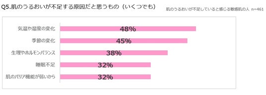 うるおい不足の原因だと思うものを質問したところ、気温や湿度の変化が48%、季節の変化が45%と外的環境を挙げる方が多く、次いで生理やホルモンバランスが38%、睡眠不足が32%、肌のバリア機能が弱いからが32%と内的要因や肌の性質だと感じる人が多いことがわかりました。