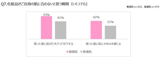 敏感肌の人が「化粧品が自分には合わないと感じる」のは、使った後に肌がヒリヒリ・ピリピリする、かゆみを感じるといった肌への刺激感を実感した時であり、普通肌の人のスコアとも大きな差があることがわかりました。