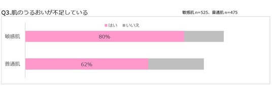 敏感肌、普通肌それぞれに「自身の肌のうるおいが不足していると思うか」を質問したところ、敏感肌では80%がそう思うと答えたのに対し、普通肌では62%にとどまることがわかりました。
