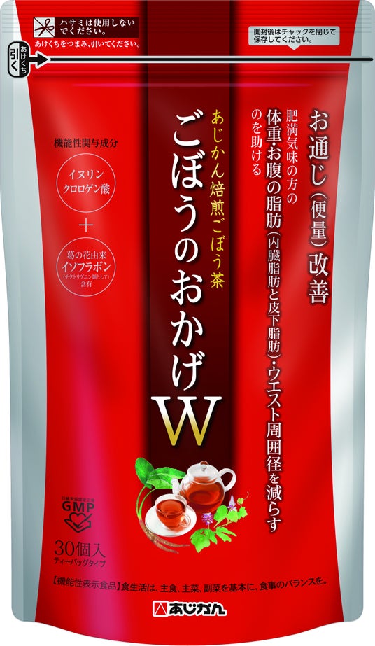 お通じを改善するイヌリンとクロロゲン酸、肥満気味な人の体重やお腹の脂肪(内臓脂肪・皮下脂肪)を減らすのを助ける葛の花由来イソフラボンを配合したティーバッグタイプのお茶「あじかん焙煎ごぼう茶 ごぼうのおかげ W(ダブル)」を開発。