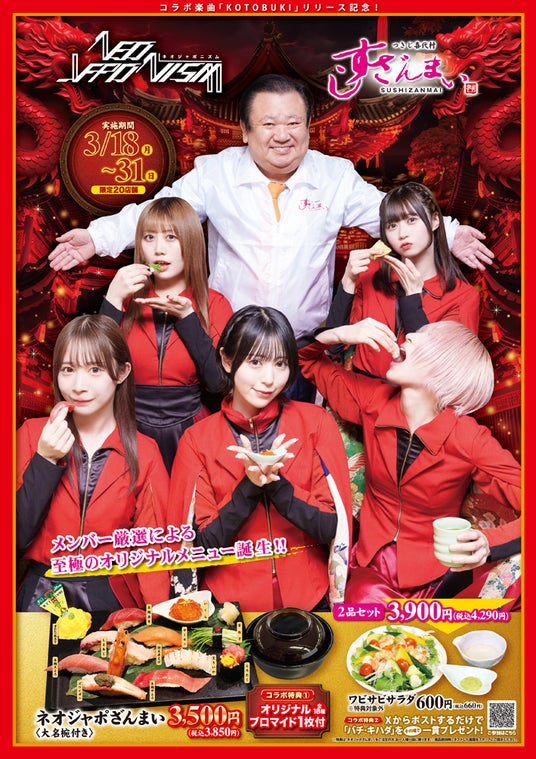 寿司チェーン店「つきじ喜代村すしざんまい」を運営する株式会社喜代村(本社:東京都中央区、以下「喜代村」)は、女性5人組ガールズグループ「NEO JAPONISM(滝沢ひなの/辰巳さやか/瀬戸みるか/朝倉あい/福田みゆ)」とのコラボ楽曲『KOTOBUKI』の3月18日(月)先行配信、3月24日(日)全国流通開始に合わせ、3月18日(月)より14日間、「すしざんまい」限定20店舗にてコラボメニュー『ネオジャポざんまい』(大名椀付き/3,500円・税込3,850円)と『ワビサビサラダ』(600円・税込660円)の2種を販売いたします。