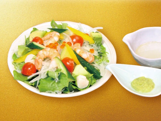 エビ、小柱、いくらが入った海鮮風のサラダにすしざんまいオリジナルのセパレートドレッシングにワサビを混ぜ、サラダにかけてお召し上がりください。ツンとしたワサビの刺激とともに、爽やかな風味が口の中いっぱいに広がります。
