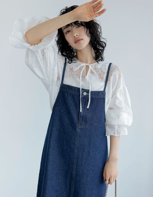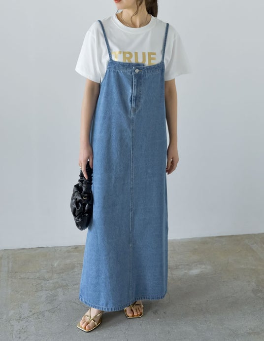 デニムパンツがそのままワンピースになったようなデザインが特徴のキャミワンピース。