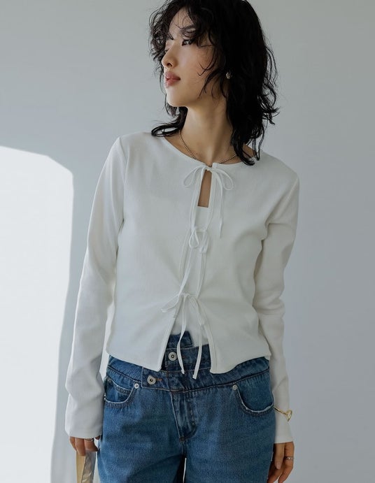 リボンがアクセントになった、前後2WAYで着用できるデザイントップス。