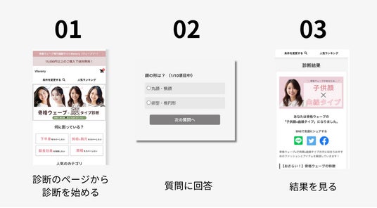 ユーザーは、スマートフォンからWaverryの「骨格ウェーブ×顔タイプ診断」の診断ページ(https://www.waverry.jp/diagnosis) にアクセスします。 その後、画面の案内に従って「顔のパーツの特徴」といった全11個の質問に回答をします。