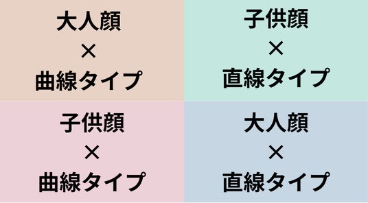 顔タイプの診断は、「大人顔or子供顔」「顔のパーツが曲線or直線」の4項目の組み合わせによって決定します。