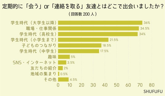 どこで定期的に「会う」or「連絡を取る」友達と出会ったかに関しては1位「学生時代(大学生以降)(36%)」、2位「職場・仕事関係(34.5%)」でした。