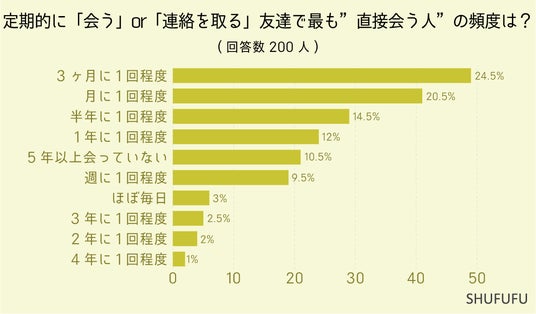 定期的に「会う」or「連絡を取る」友達で最も”直接会う人”の頻度を尋ねたところ、1位は「3ヶ月に1回程度(24.5%)」、2位「月に1回程度(20.5%)」となりました。ほぼ毎日という方は「3%」となりました。