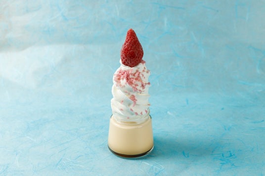 当店の人気商品「選べるプリンソフト」を春の季節仕様に盛り付けた一品。下のプリンはお好きなフレーバーのプリンが選べて、その上には真っ白なミルクのソフトクリーム。さらに頂点にはフローズンした兵庫県産のいちごが乗っています。そして期間限定で桜フレークも乗っており、桜が舞う天守閣をイメージしたプリンです。