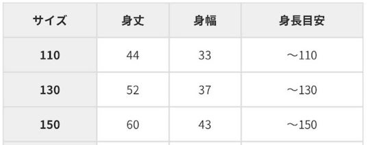 子ども用ロングTシャツサイズ表(単位:cm、目安であり実際の商品には個体差がでる場合があります)