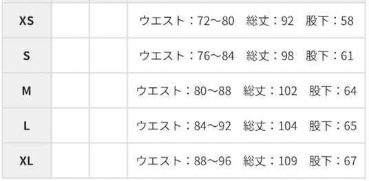 大人用スェットパンツサイズ表(単位:cm、目安であり実際の商品には個体差がでる場合があります)
