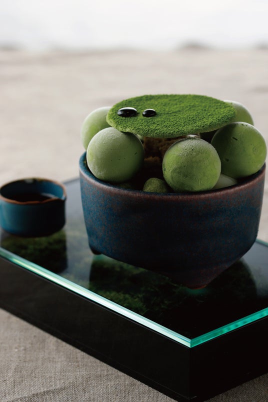 【価 格】1,600円(税込)■抹茶チュイル ■自家製まんまる抹茶アイス ■ふわふわ黒糖ジェノワーズ ■白玉 ■まるいお麩ショコラ ■抹茶ゼリー ■バニラのエスプーマ ■自家製抹茶アイス ■自家製あんこ ■黒蜜(別添え)