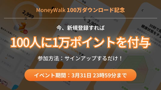 ポイ活アプリ「MoneyWalk」が全世界で100万ダウンロードを達成しました。この記念に感謝の気持ちを込めて、100万ポイントの倍となる200万ポイントを日本のユーザー様にプレゼントいたします。