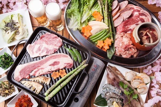◇枝豆 ◇前菜3種盛り ◇赤海老、丸ごとイカ、大粒ホタテの海鮮盛り合わせ ◇牛カルビ・豚肩ロース・鶏モモ肉・ソーセージのお肉4種盛り合わせ ◇野菜の盛り合わせ4種(玉ねぎ・人参・茄子・椎茸)◇サンチュ◇桜餅