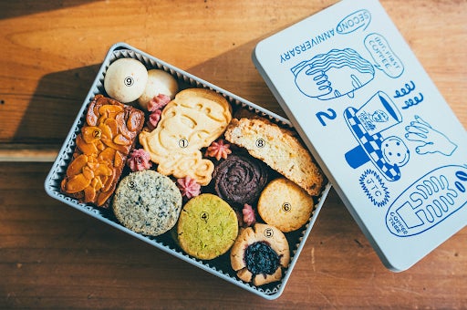 2周年を記念してデザインしたクッキー缶にはこだわりの10種類のクッキーを詰め合わせました。200個の数量限定です。