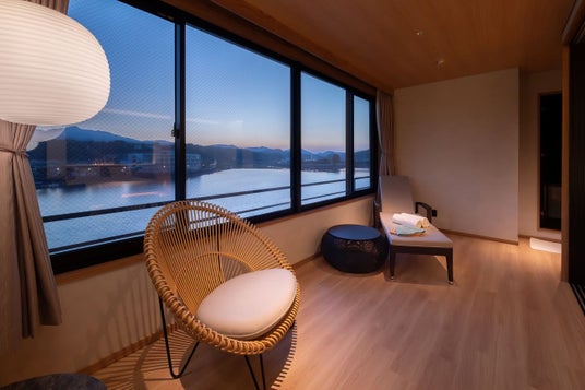 客室との間の扉を閉めれば独立した空間に。プライベートならではの開放感を感じ、三隈川を展望しながら窓を開けて外気浴など、さまざまな楽しみ方が出来ます!