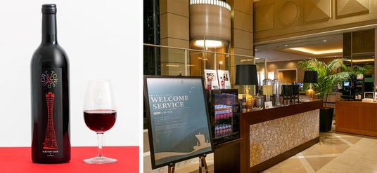 写真左:神戸ポートタワー特別ワイン(赤) / 写真右:ウェルカムサービス提供場所