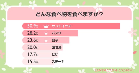 お花見デートの際に食べるものを聞いたところ、「サンドイッチ」が最多の50.9%で2位の「パスタ」28.2%に大差をつけて1位となりました。