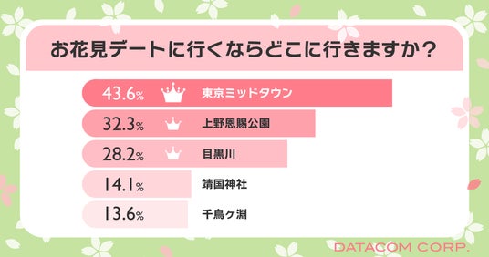 お花見デートに行くならどこに行くかという質問に対して、43.6%の人が「東京ミッドタウン」と回答。次点で「上野恩賜公園」32.3%、「目黒川」28.2%と続きました。