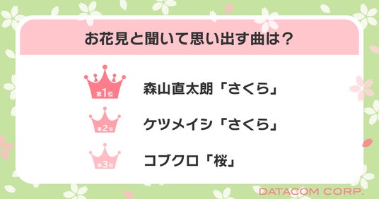 お花見と聞いて思い出す曲を聞いたところ、森山直太朗の「さくら」が1位に。2位はケツメイシの「さくら」、3位がコブクロの「桜」と3位まで全てが“さくら”というタイトルの曲になりました。ミレニアル層が学生時代に流行した”さくら”ソングが今でも想起されるようです。