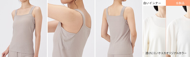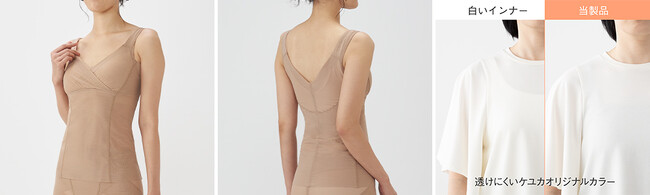 気温が上がり、服装が軽装になるにつれて、悩みとして挙がるのがインナー問題。目立たないようにするために、補正下着や機能性インナーはベージュカラーを選びがちですが、ベージュカラーだと見えたときに少し恥ずかしい気持ちになるといった声も上がっております。そこでKEYUCAでは、透けにくいことに加え、見えてもきれいなカラーをテーマにオリジナルカラーの生地を開発。商品の特性に合わせてグレーよりのベージュやピンクよりのベージュなどこだわりの詰まったカラー展開となっております。
